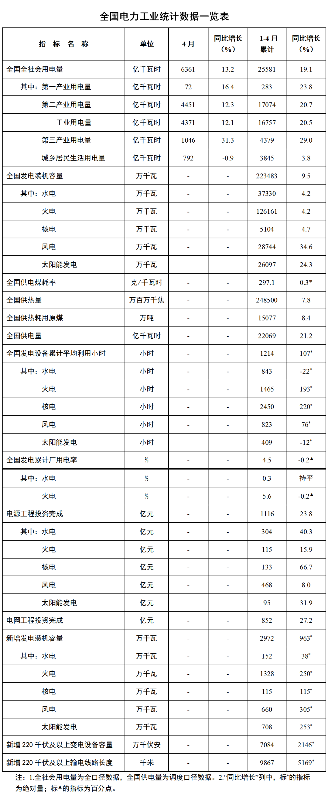 國家能源局發(fā)布1-4月份全國電力工業(yè)統(tǒng)計(jì)數(shù)據(jù)