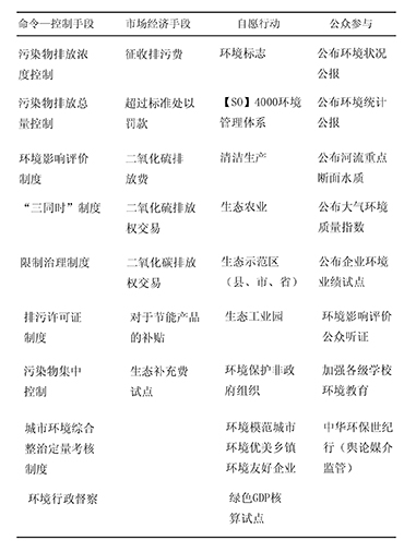 關(guān)于我國環(huán)境治理的實踐過程,張坤民等(2007) 建立了包栝命令—控制手段、經(jīng)濟(jì)刺激手段和公眾參與或稱自愿手段等多樣化的環(huán)境政策工具矩陣。見表2.1