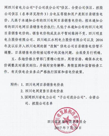 近日,四川省發 改 委發布了《四川省發展和改革委員會關于降低四川電網目錄銷售電價合理調整電價結構有關事項的通知》(以下簡稱“通知”)。通知指出,自2017年7月1日起,取消向燃煤發電企業征收工業企業結構調整專項資金,降低重大水利工程建設基金和中大型水庫移民后期扶持基金征收標準,降低后的征收標準分別為0.52分/千瓦時、0.62分/千瓦時。燃煤發電機組有關電價政策另行明確。具體情況如下: